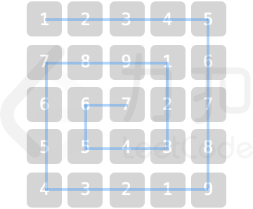num * num的二维矩阵grid(左上角坐标为[0,0]),每个位置站有一位成员。乐团共有9种乐器,乐器编号为1~9,每位成员持有1个乐器。 为保证声乐混合效果,成员站位规则为:自grid左上角开始顺时针螺旋形向内循环以1,2,...,9循环重复排列。例如当num = 5时,站位如图所示